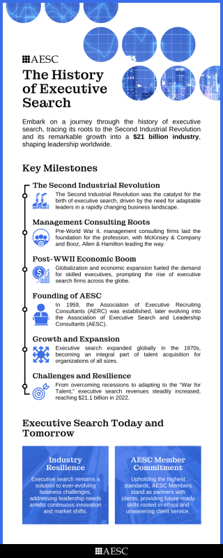 The Second Industrial Revolution set forth a chain of events that led to the birth of the executive search profession. Since then, the executive search profession has paralleled major trends in business, organizations and socio-economic development. Today, the profession generates over billion and places the top leaders worldwide.