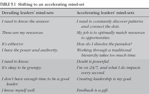 Research by Paul Brown and Brenda Hales concluded that there is a need to create “the conditions under which [people] can use all their own adaptive capacity to get to the goals they are after.” We found that the ability to learn in this way was twice as likely to be present in leaders of accelerating companies than in those of derailing ones. We set out to answer the following question: What are the few compelling shifts in mind-sets that enable leaders to be agile in this way and, in turn, to set the pace in today’s ever-changing landscape? Our answer can be found in the table below.