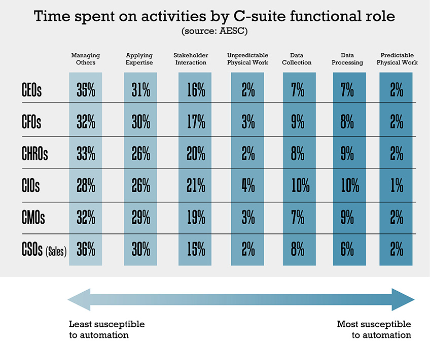 In all seven C-suite roles, we explored the time spent on the three least automatable activities (managing others, applying expertise and stakeholder interaction) totals over 75% – and scores over 80% in the case of CEOs, CMOs, CSOs and GCs. Excelling at these activities requires a combination of outstanding leadership traits – such as agility, emotional intelligence, decisiveness – and deep industry and functional knowledge built over decades of professional experience. These factors are so nuanced and differ so much from one person to another, which makes it much harder to automate.