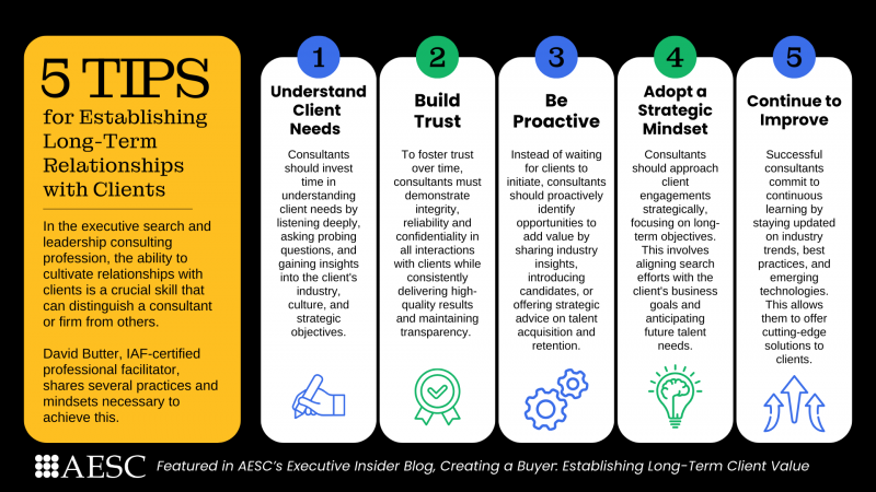 Creating a "buyer" in the context of executive search and leadership consulting involves establishing a long-term relationship with clients where they see the consultant or firm as their preferred choice for executive talent solutions.